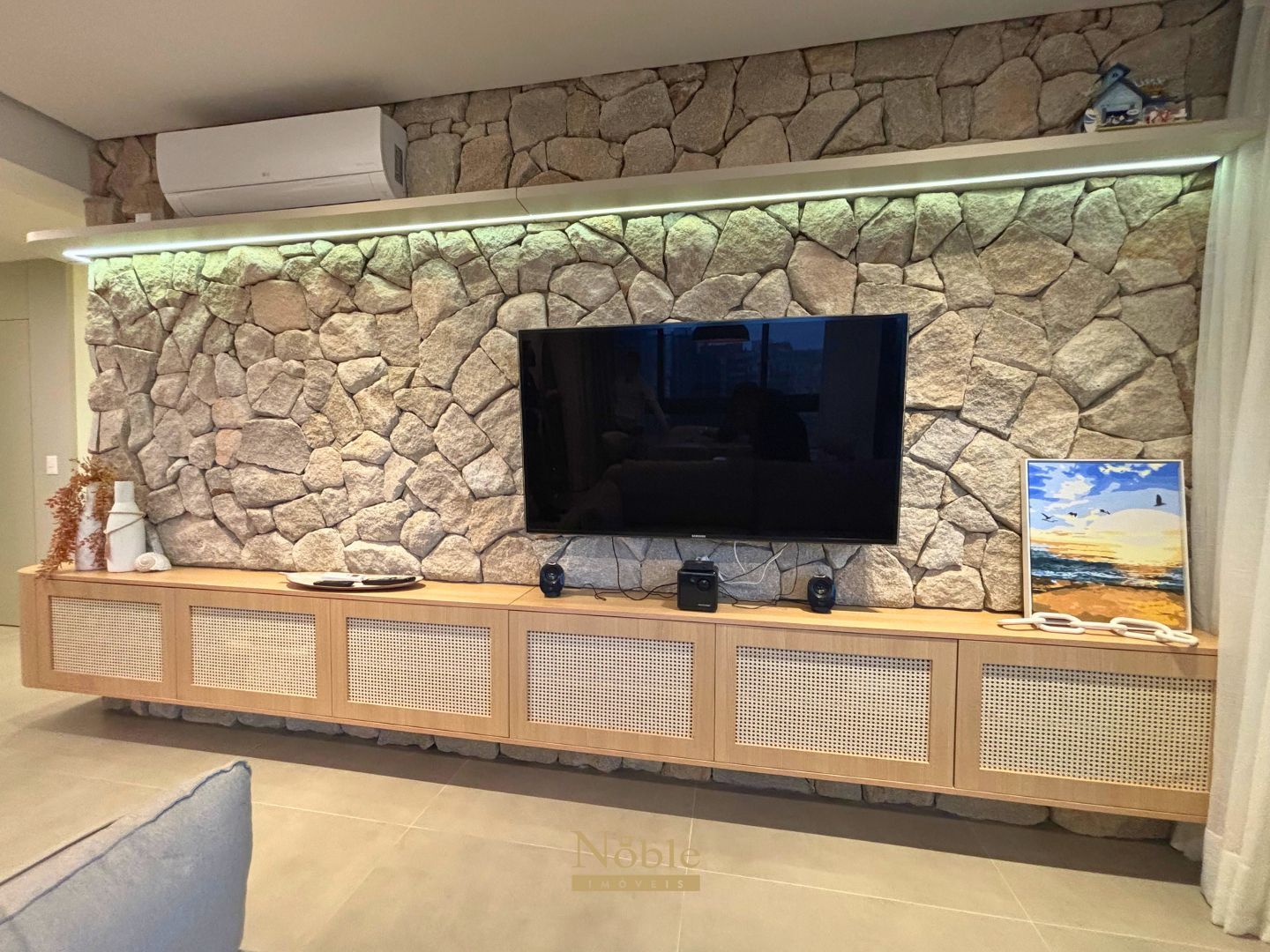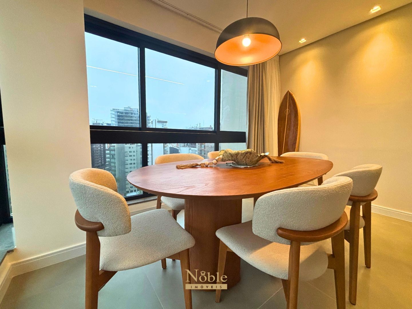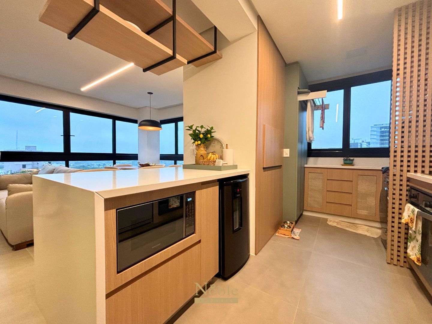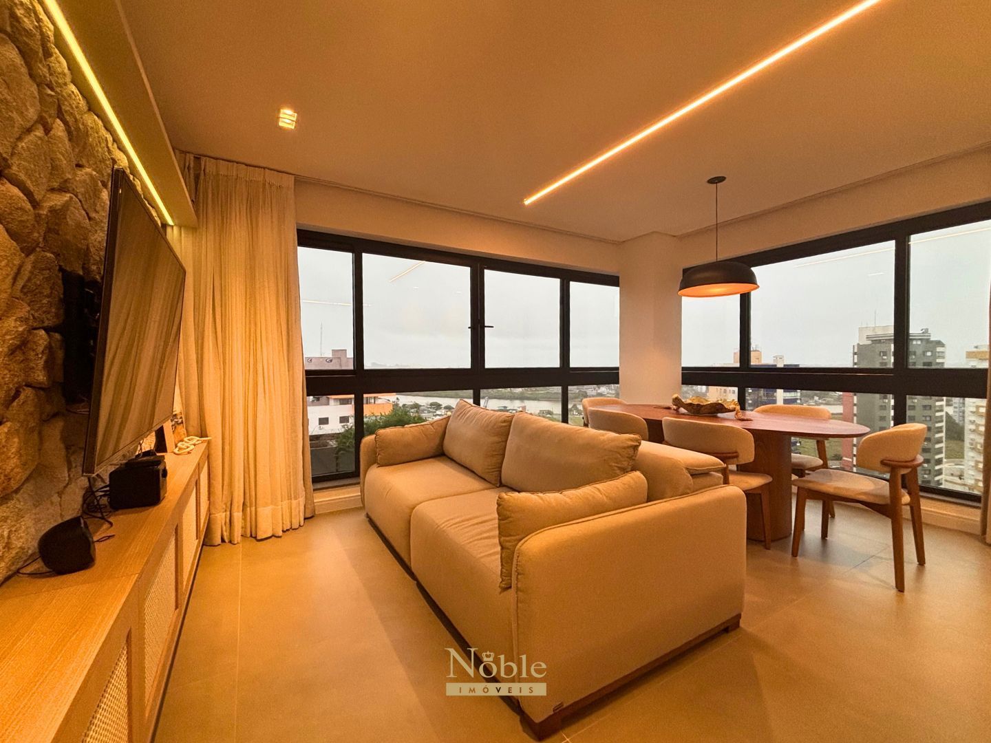 Living integrado com sala de estar, jantar e almoço;