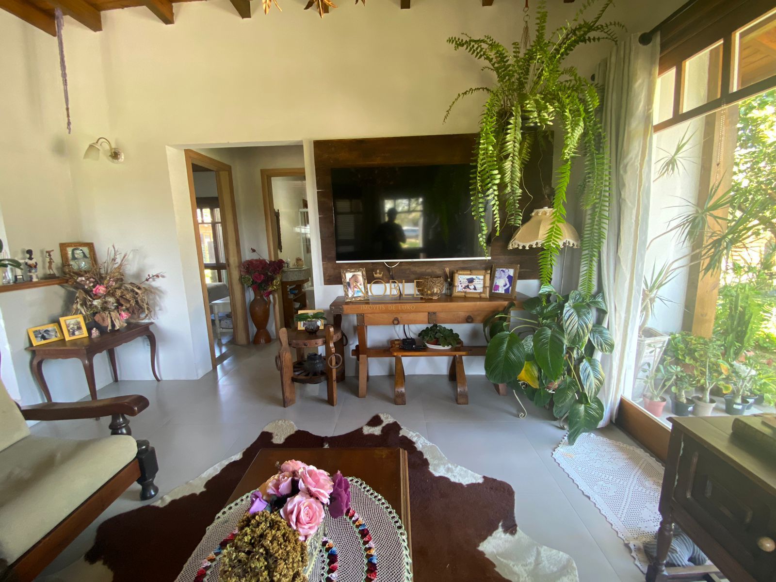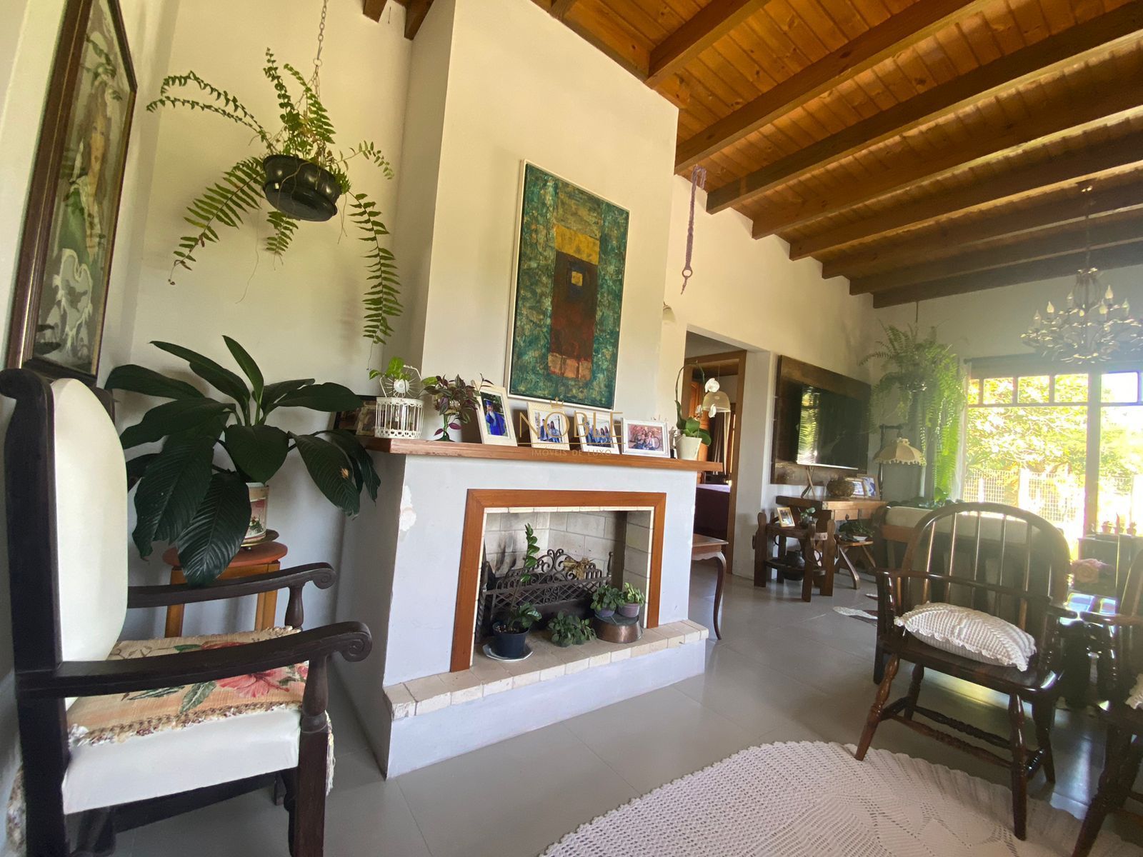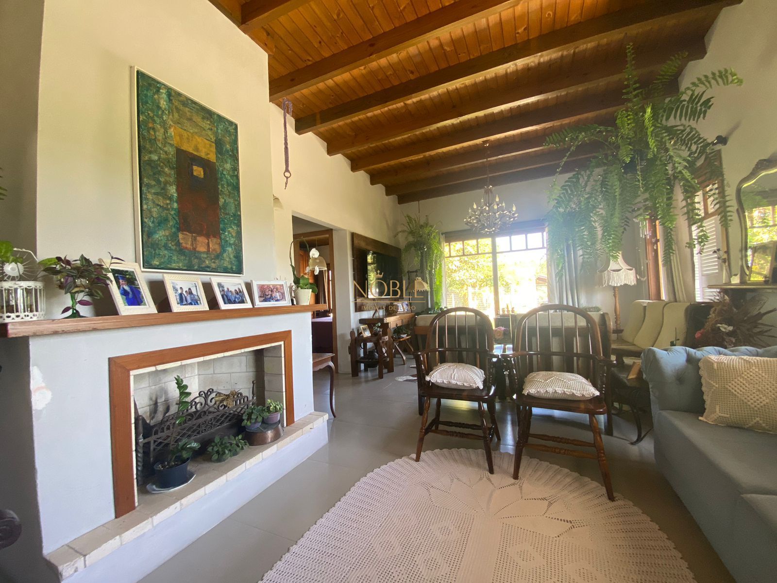 A sala de estar é espaçosa e convidativa, dividida em dois ambientes - uma área com lareira para aconchegantes noites de inverno e outra destinada ao entretenimento com televisão.