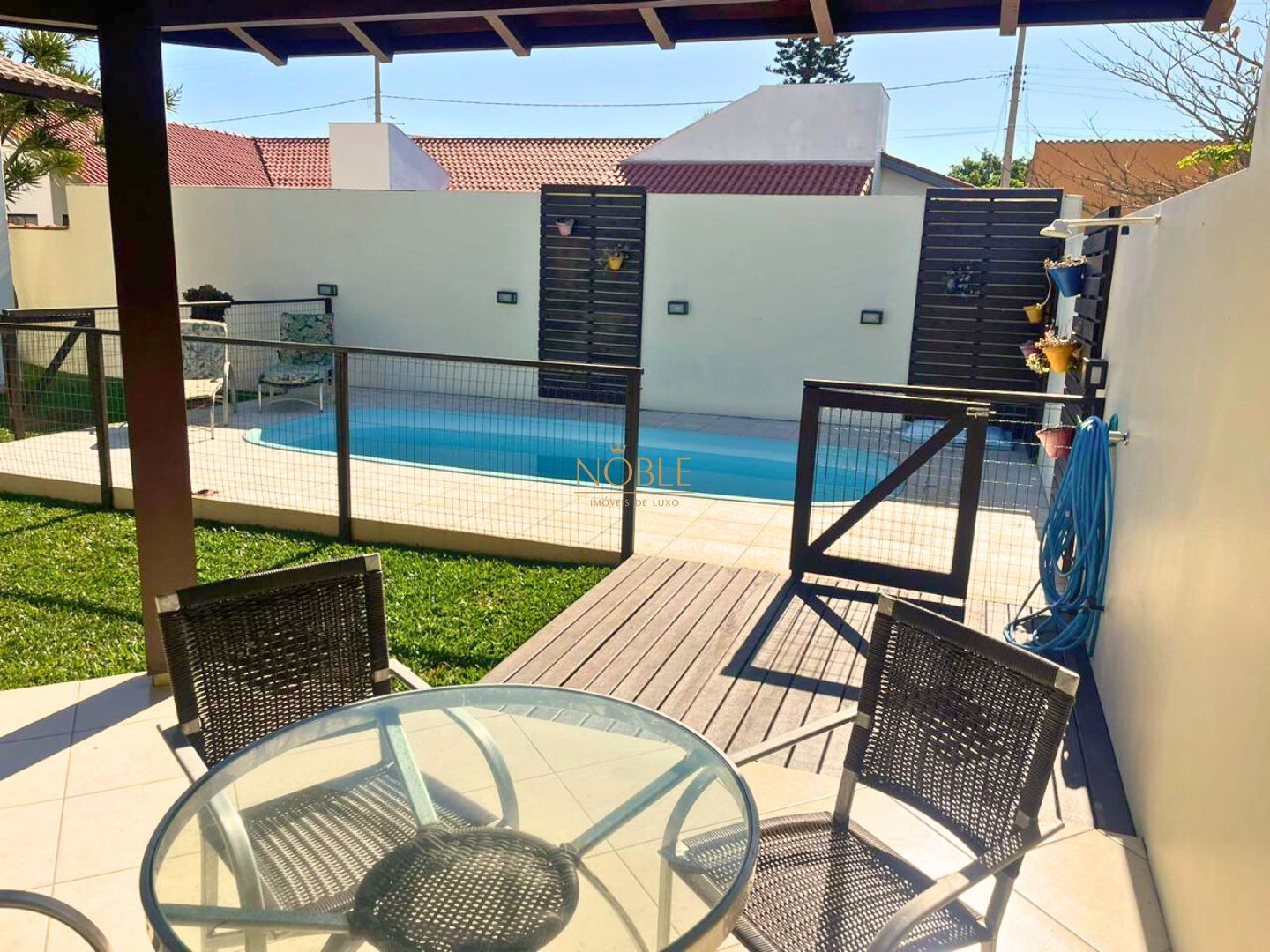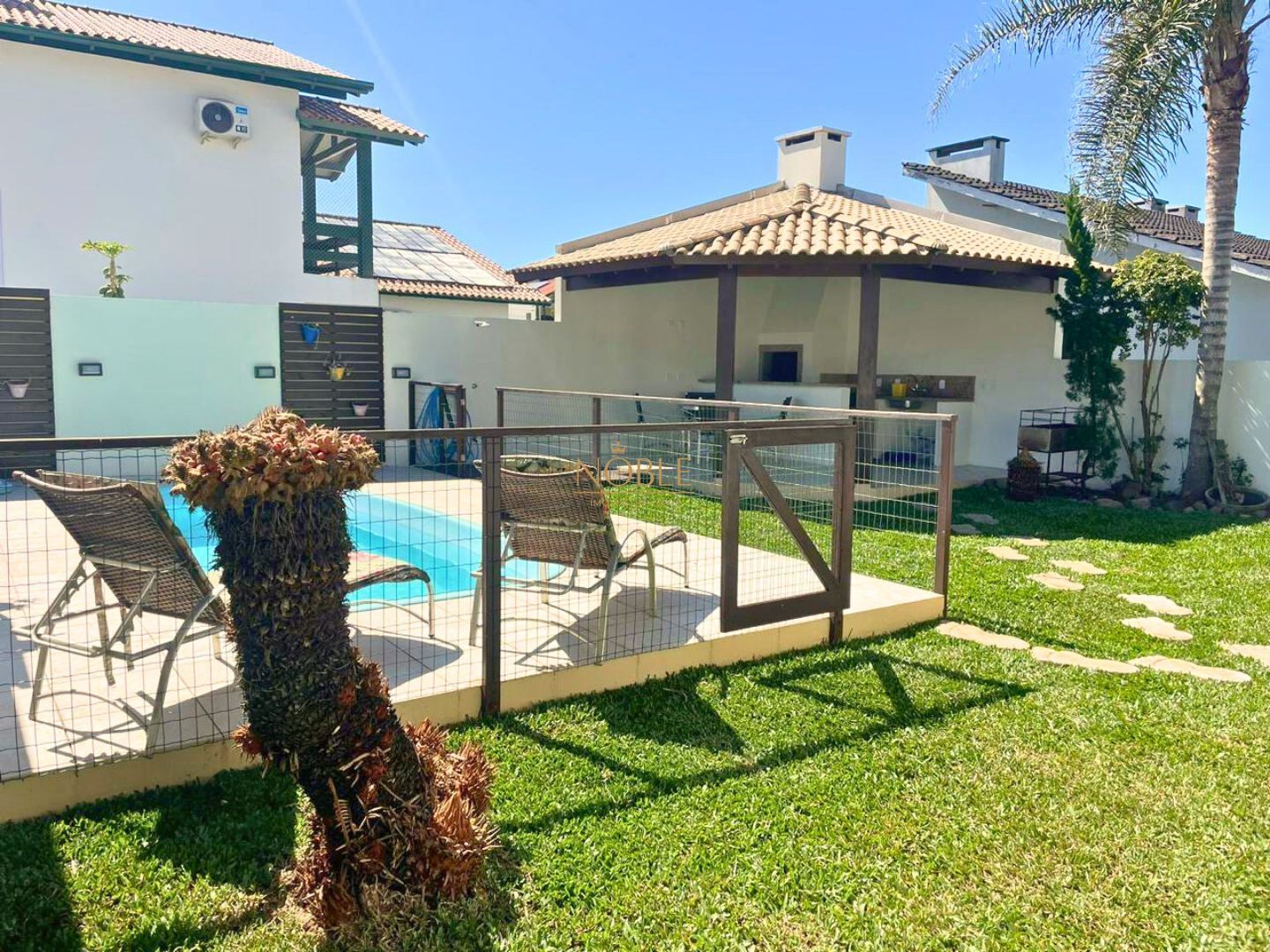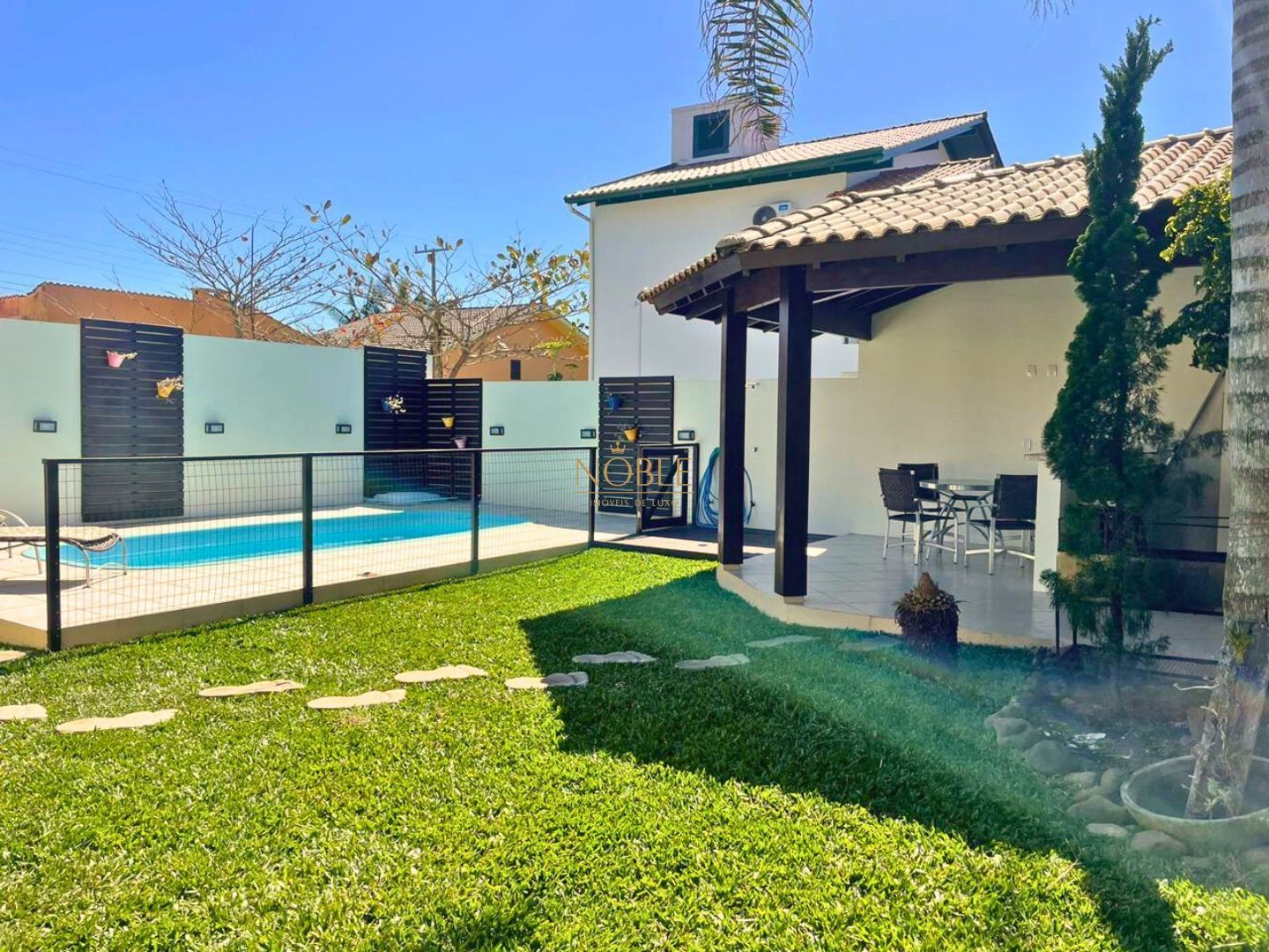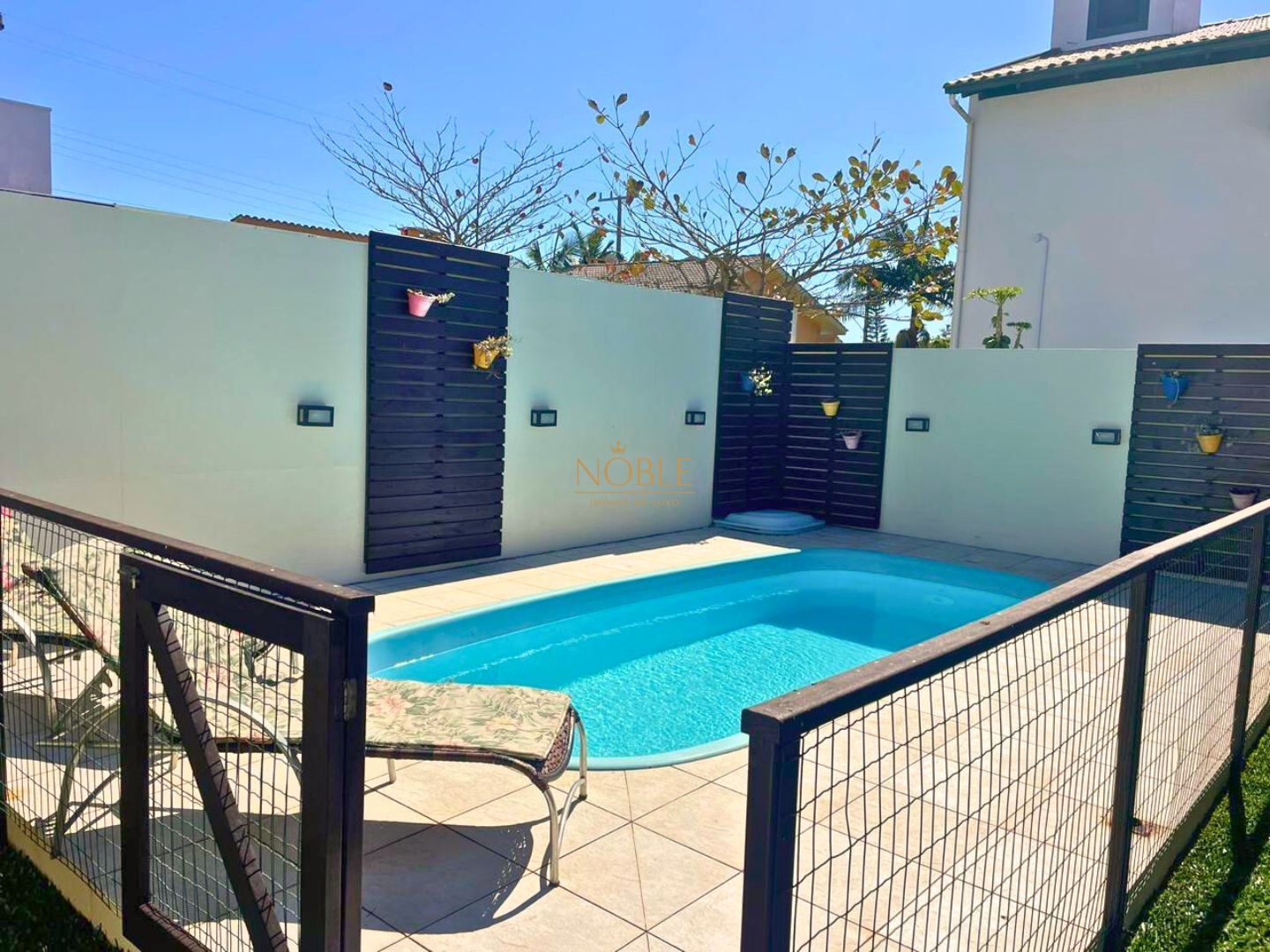 Quintal fechado com excelente espaço para lazer, incluindo piscina e churrasqueira, perfeito para momentos de descontração
