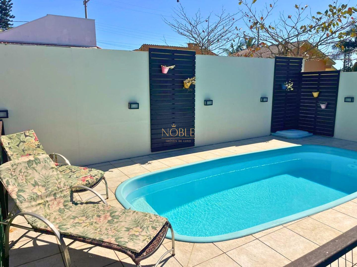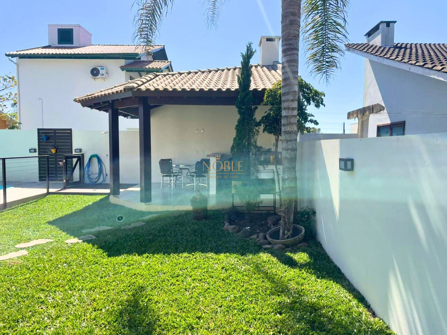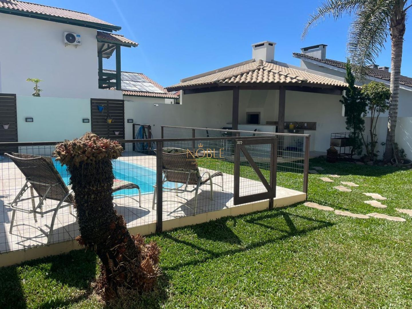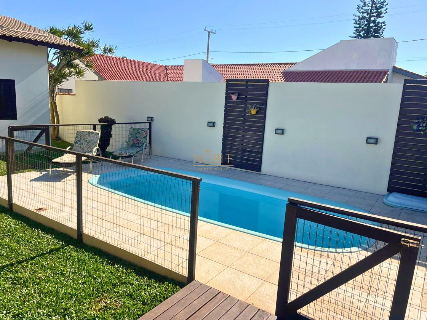 Quintal fechado com excelente espaço para lazer, incluindo piscina e churrasqueira, perfeito para momentos de descontração