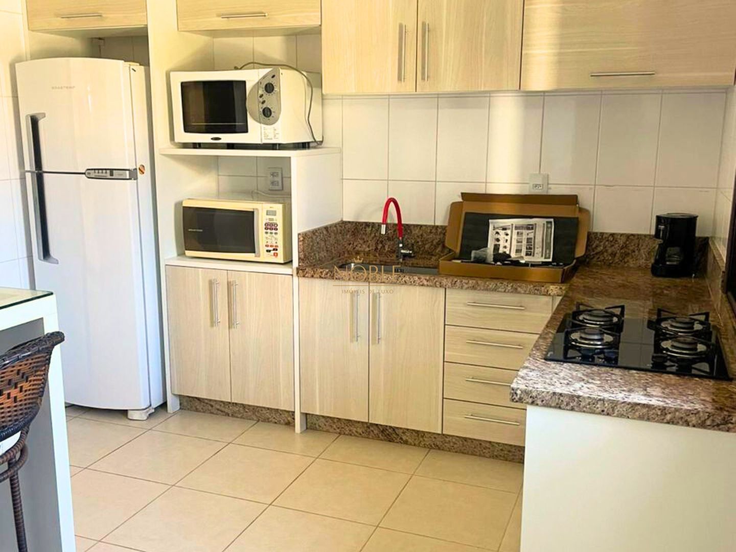 Cozinha gourmet integrada à área social, equipada com móveis planejados e eletrodomésticos modernos