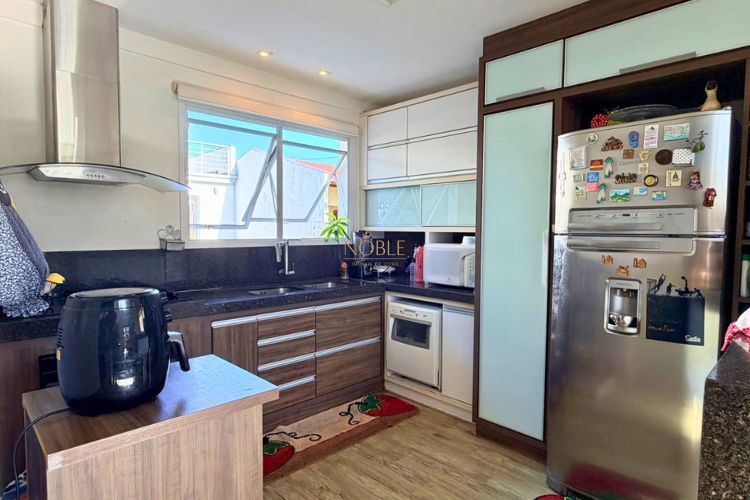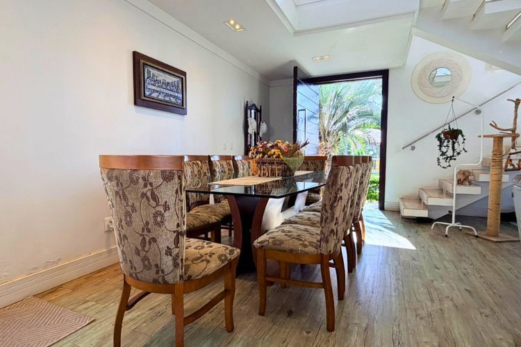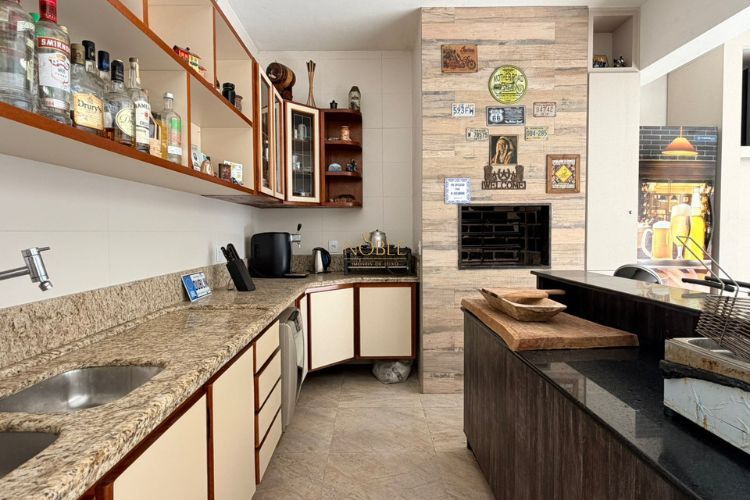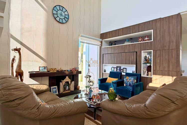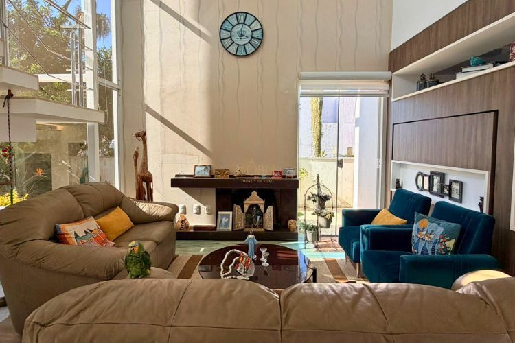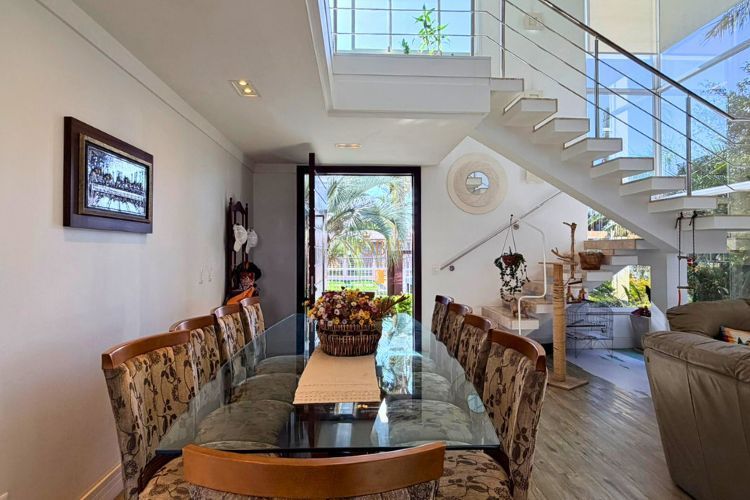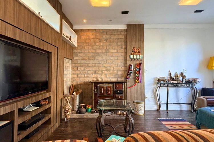 O imóvel conta com 5 dormitórios, sendo 1 suíte, além de 5 banheiros e garagem para até 4 veículos. A área social é composta por sala de estar com lareira, sala de jantar integrada e cozinha ampla com móveis planejados.