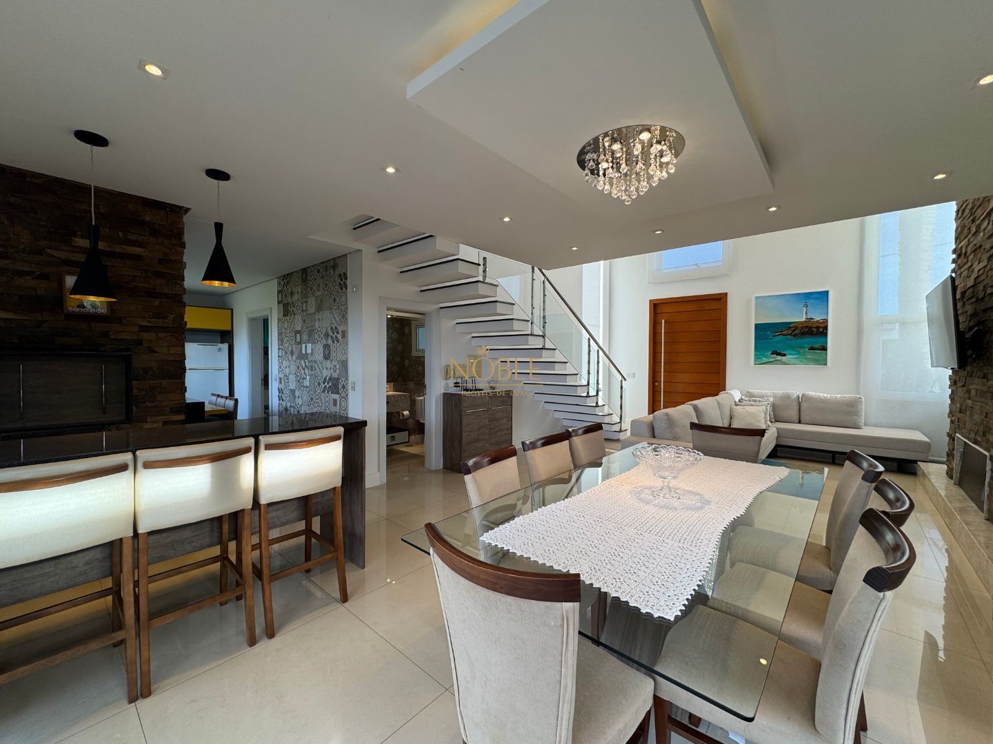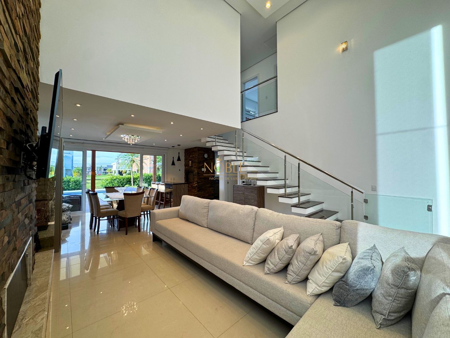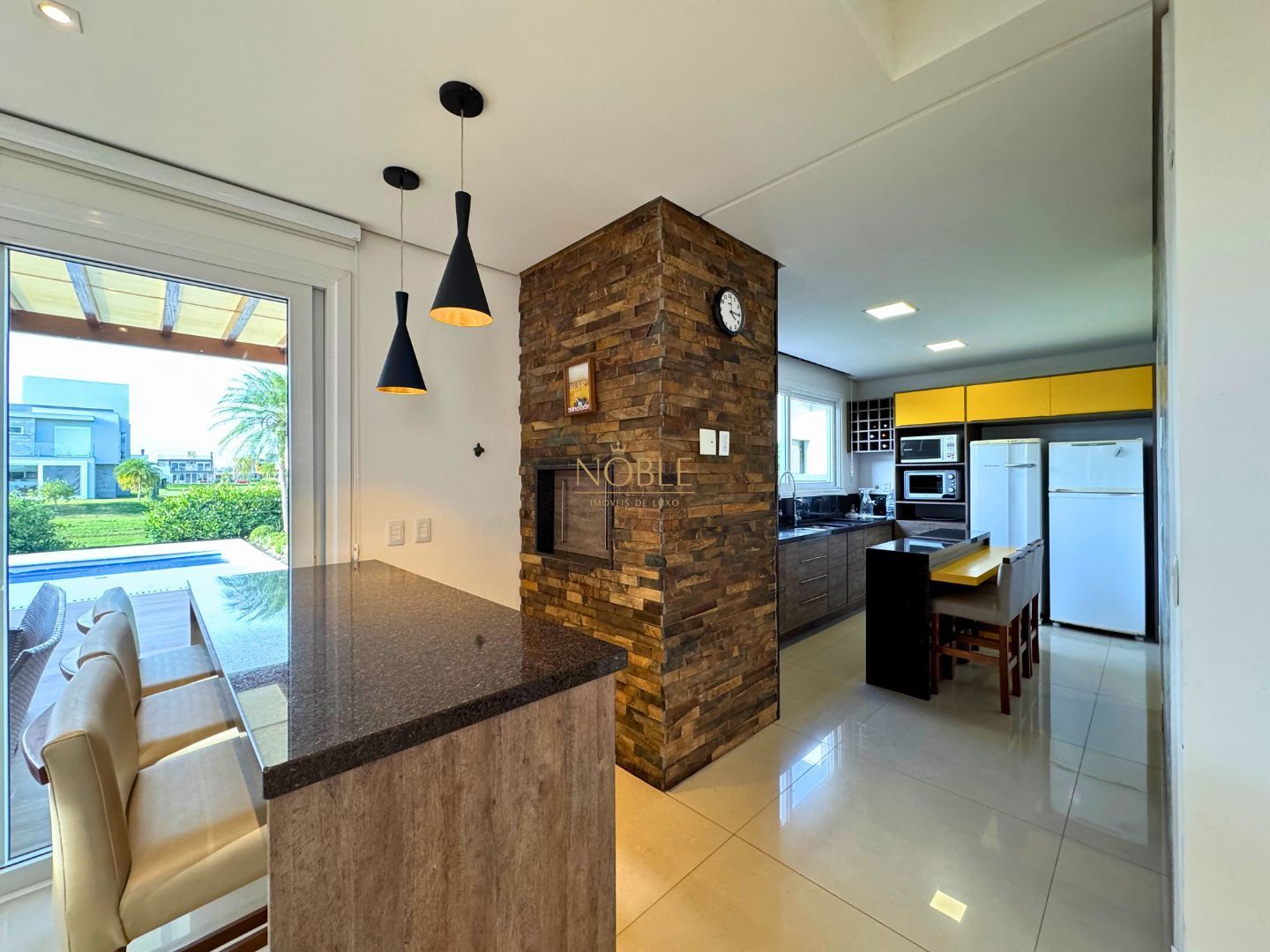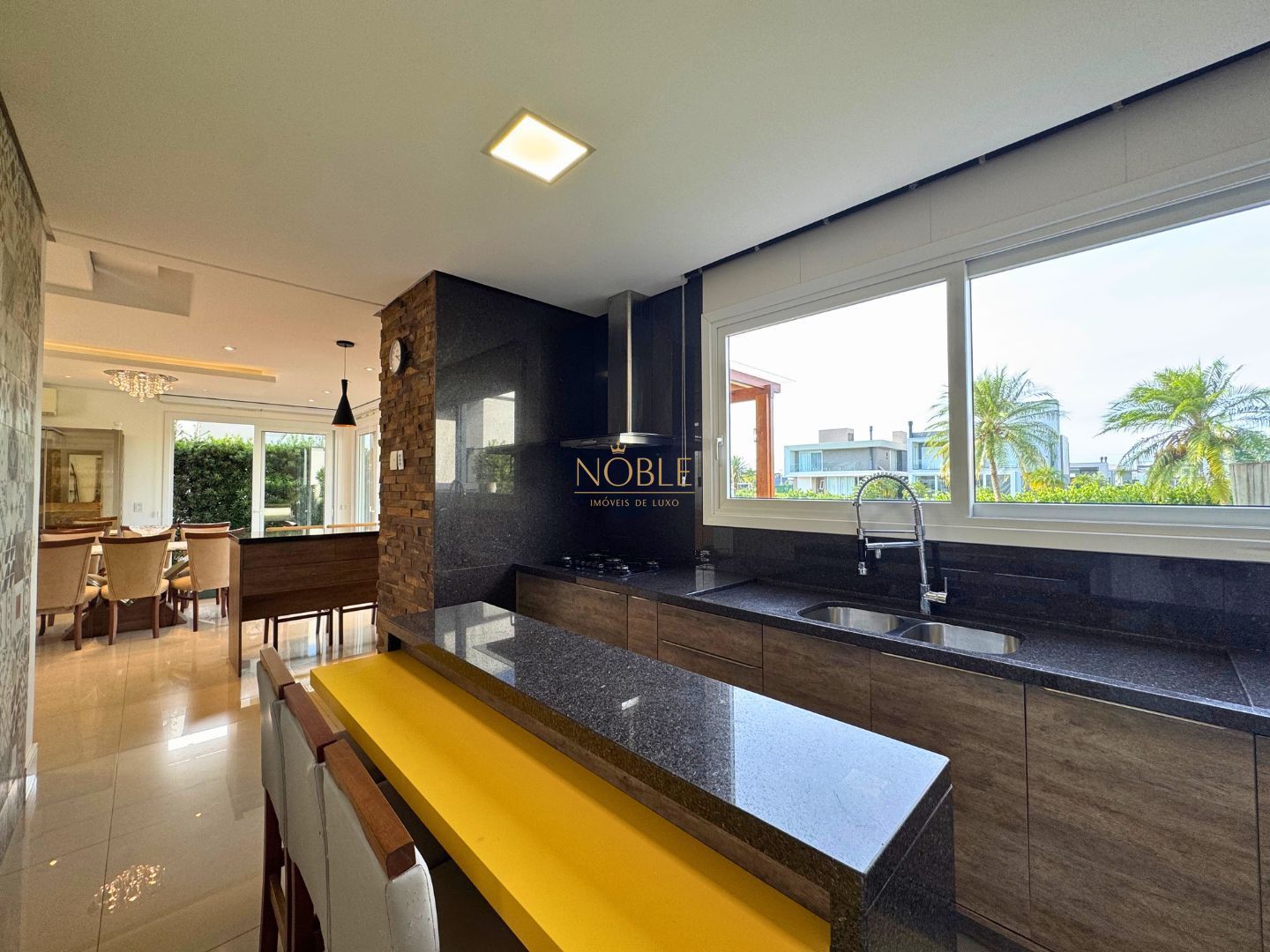 A cozinha americana, ampla e integrada à sala de jantar, conta com móveis planejados e conexão direta com a área gourmet equipada com churrasqueira. O imóvel possui ainda área de serviço, lavanderia, entrada lateral, jardim, quintal e uma varanda com vista incrível para o lago.