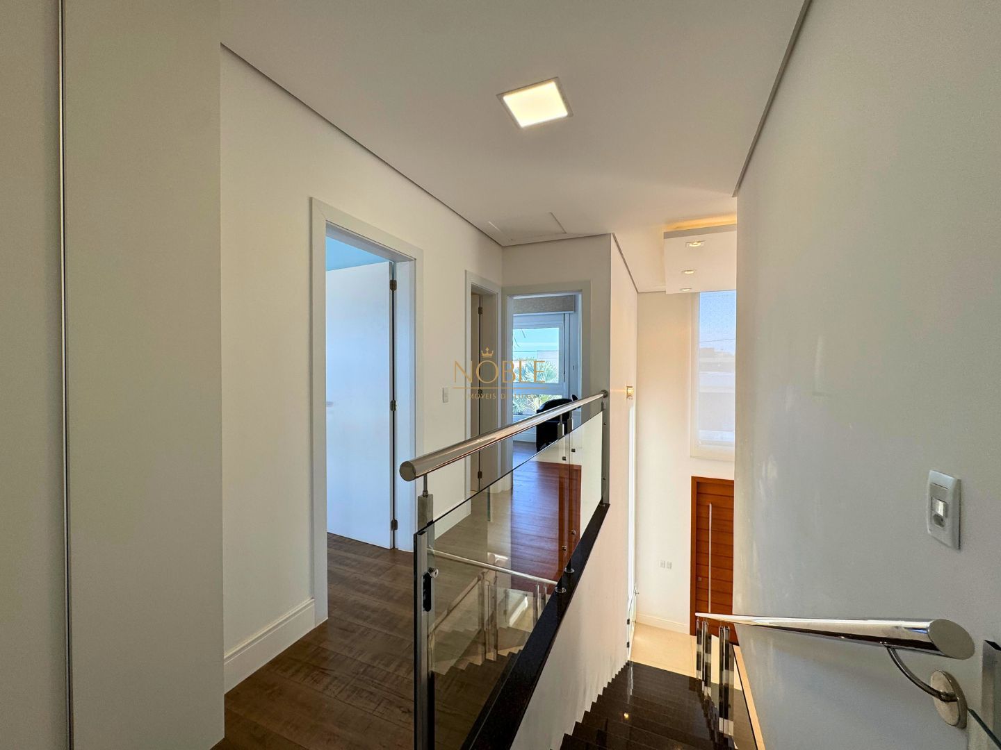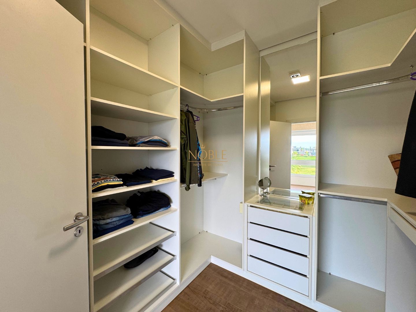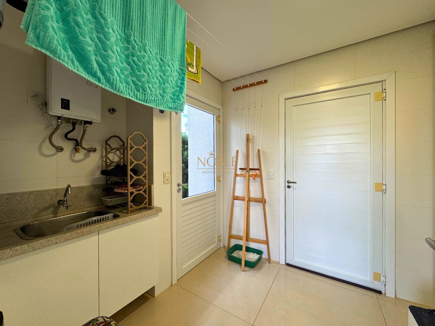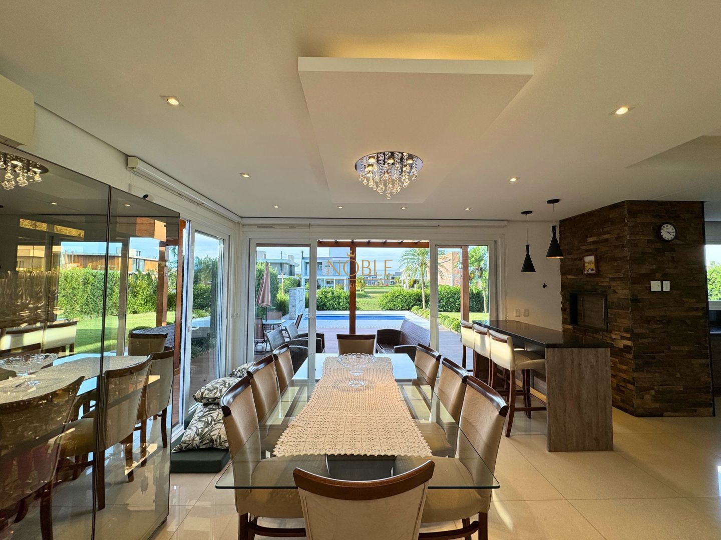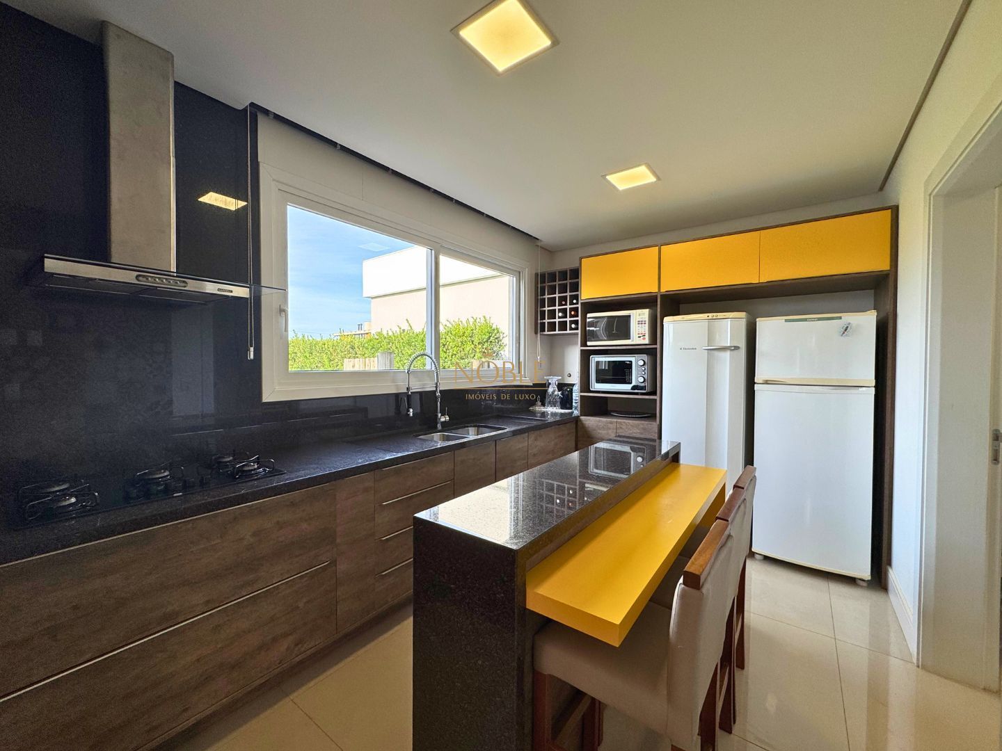 A cozinha americana, ampla e integrada à sala de jantar, conta com móveis planejados e conexão direta com a área gourmet equipada com churrasqueira. O imóvel possui ainda área de serviço, lavanderia, entrada lateral, jardim, quintal e uma varanda com vista incrível para o lago.