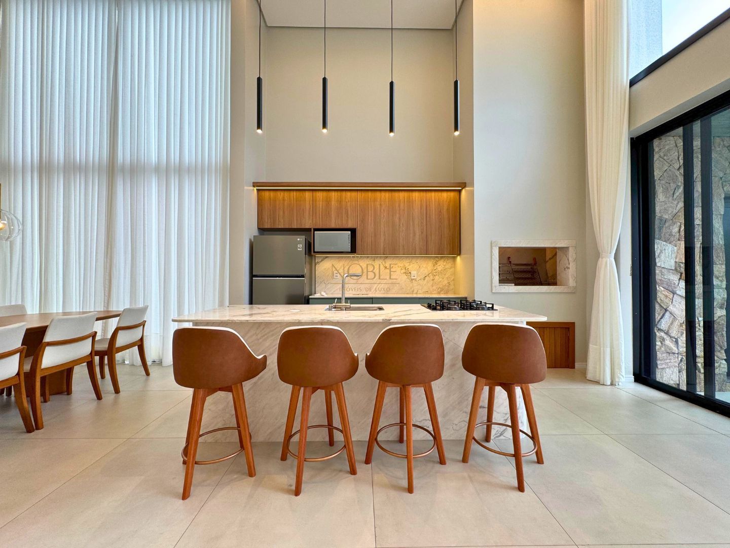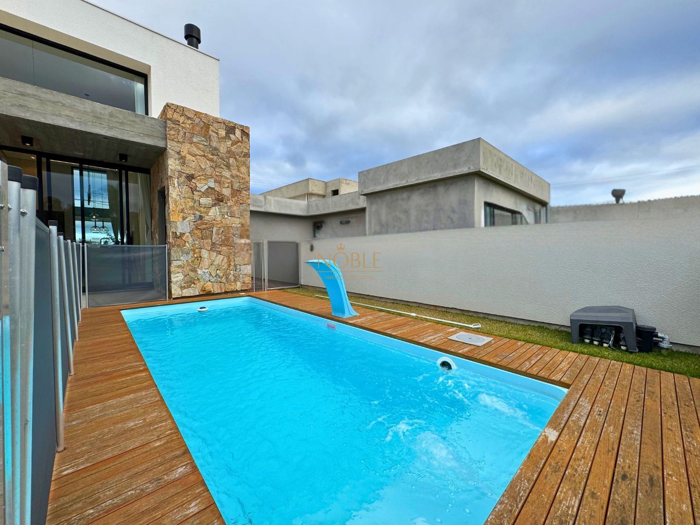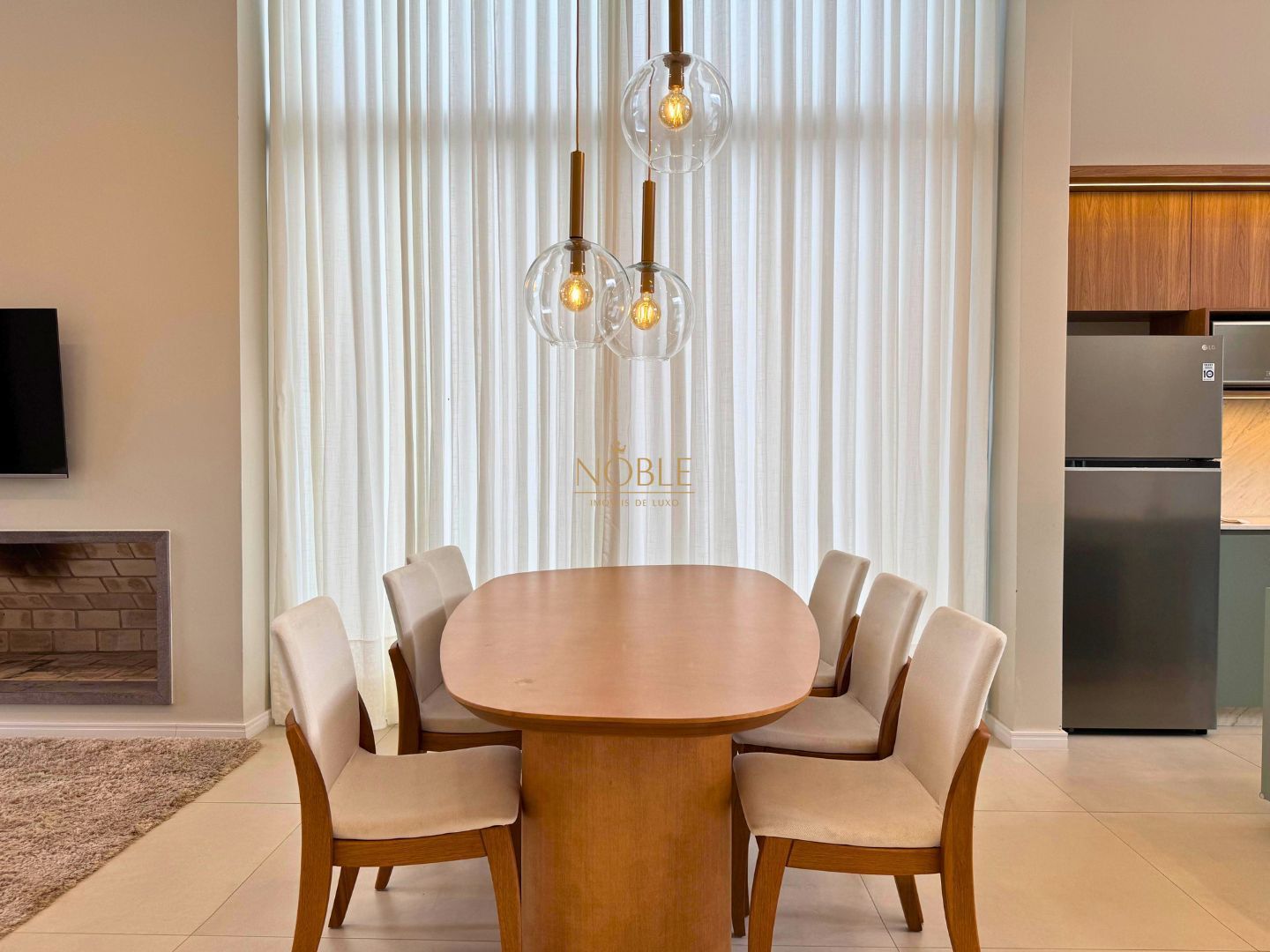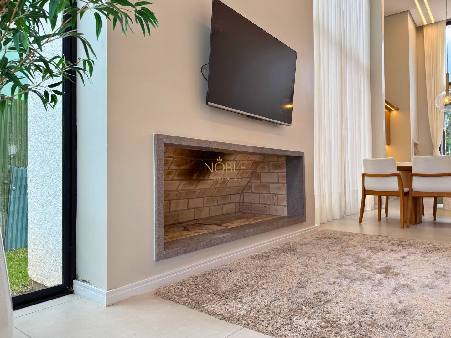 A casa conta com 201m² de área útil, 03 suítes, sala de estar, jantar e cozinha, lavabo, lareira, churrasqueira, espaço coberto para três automóveis,