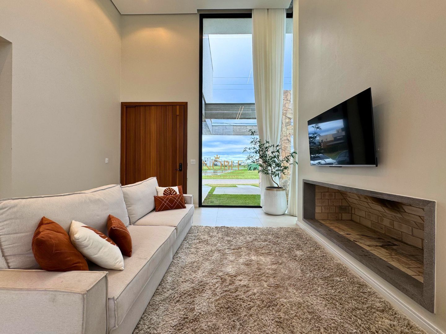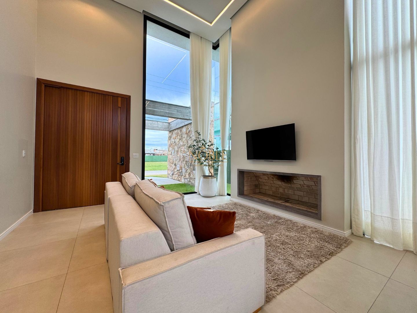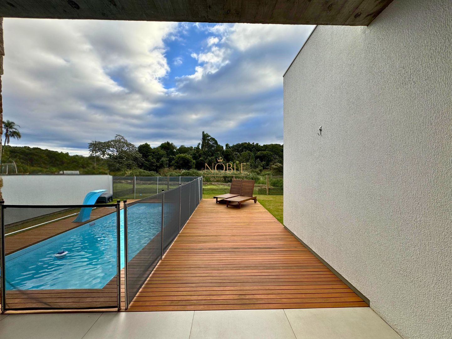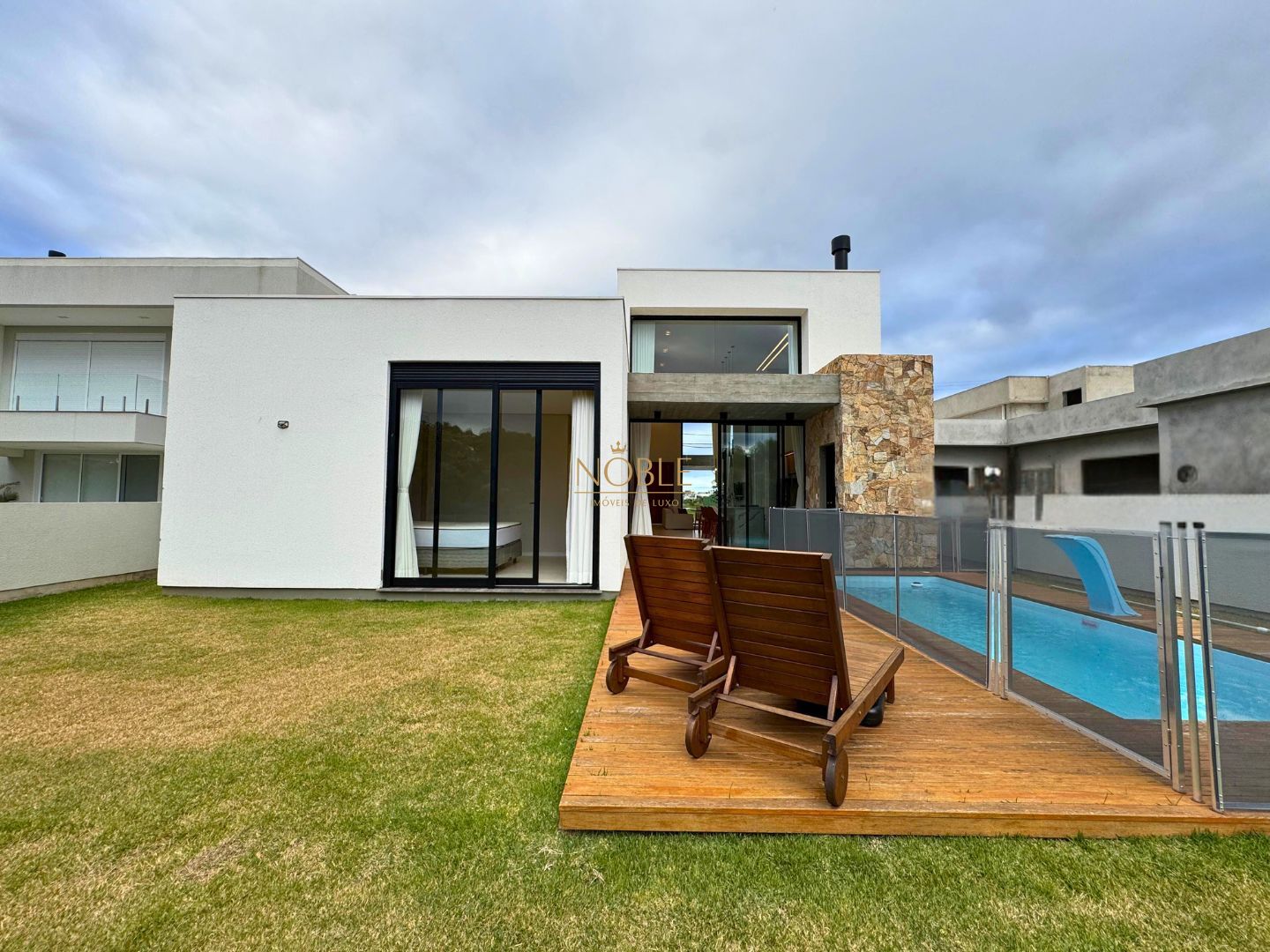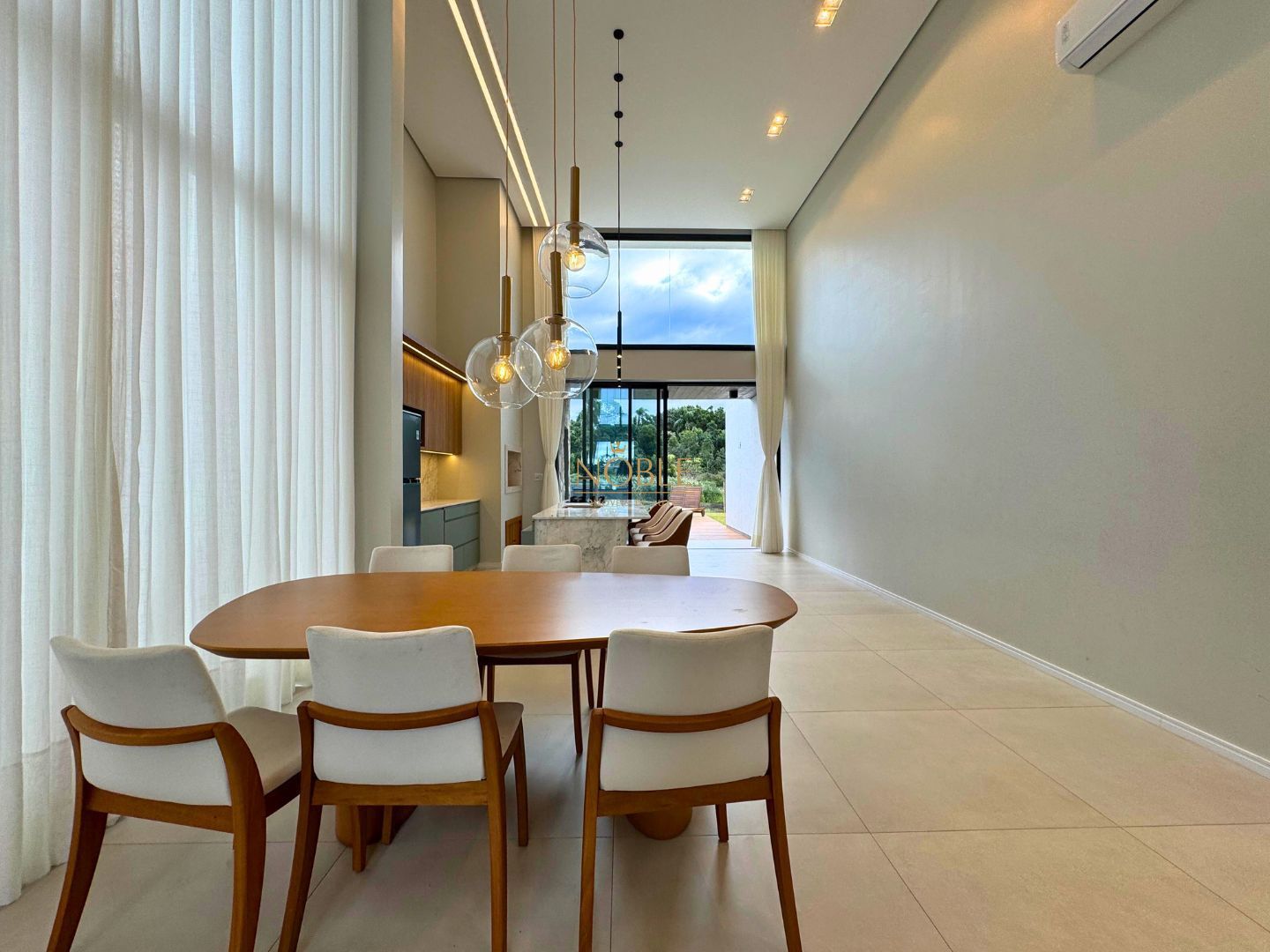 A casa conta com 201m² de área útil, 03 suítes, sala de estar, jantar e cozinha, lavabo, lareira, churrasqueira, espaço coberto para três automóveis,