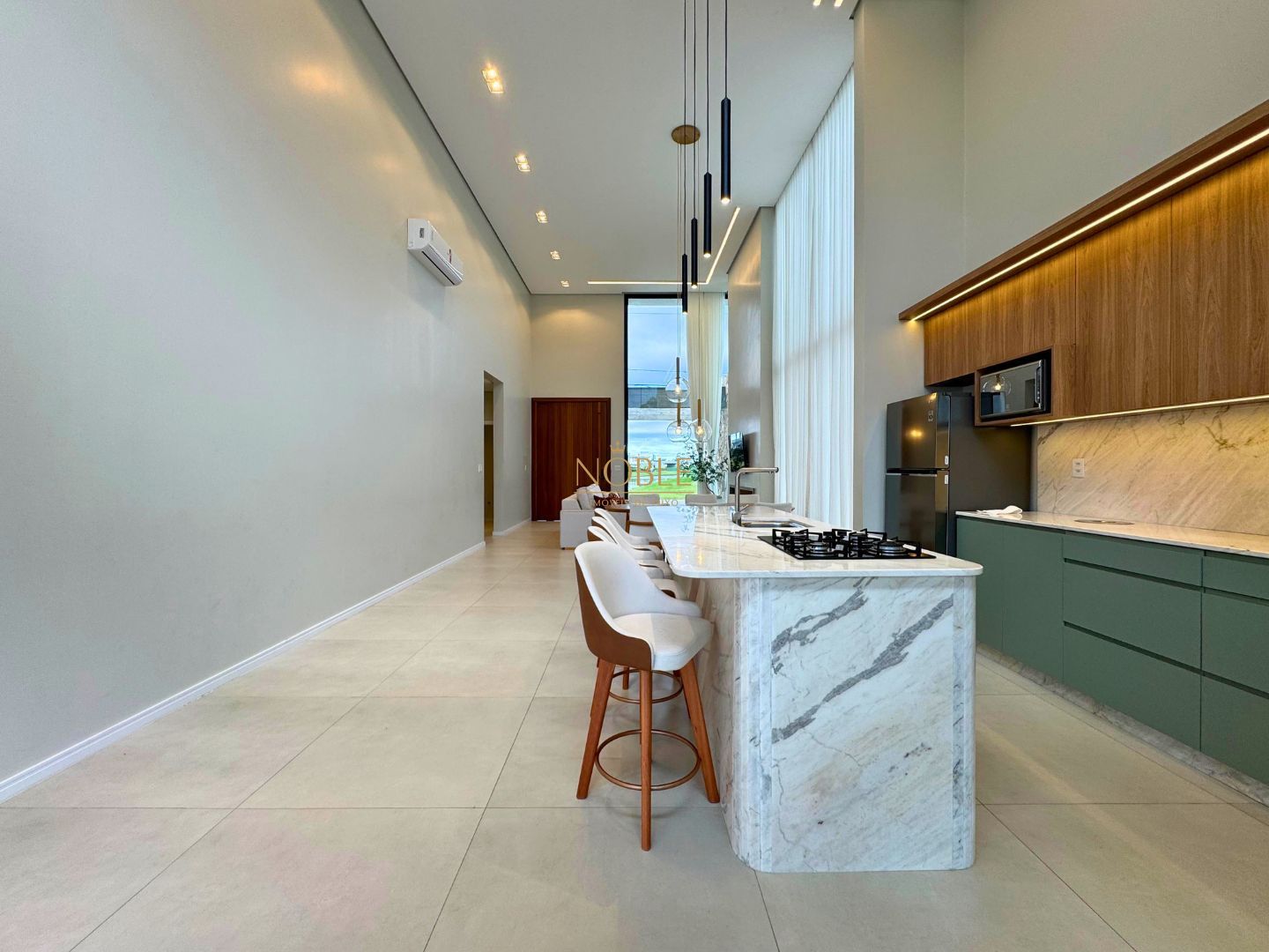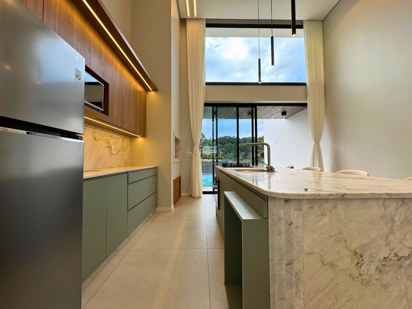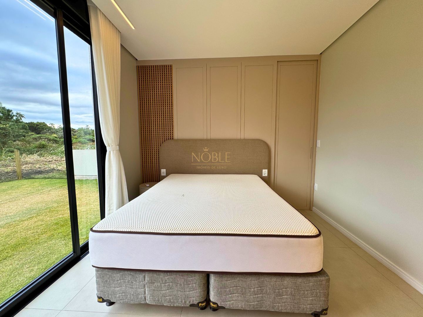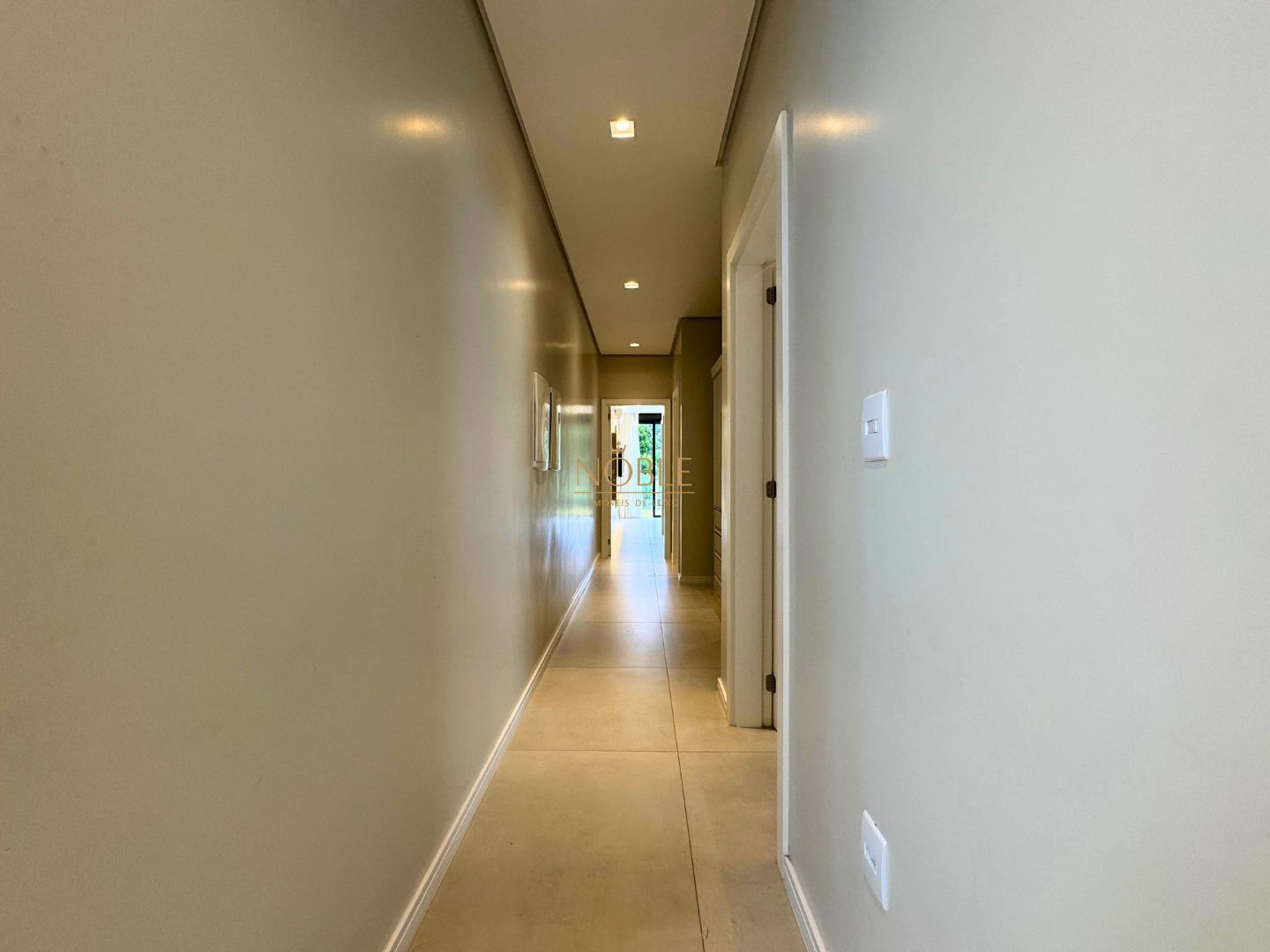 A casa conta com 201m² de área útil, 03 suítes, sala de estar, jantar e cozinha, lavabo, lareira, churrasqueira, espaço coberto para três automóveis,