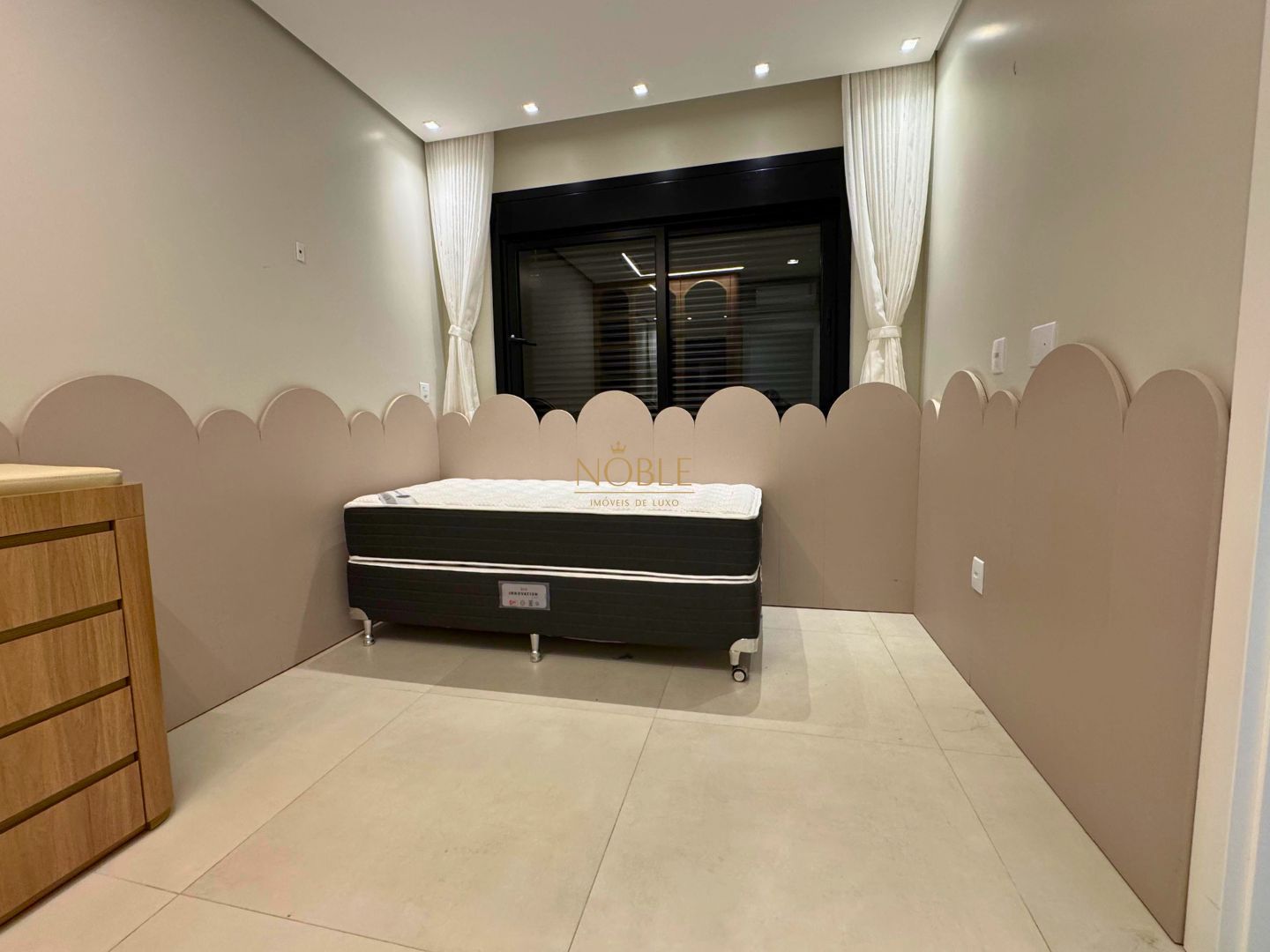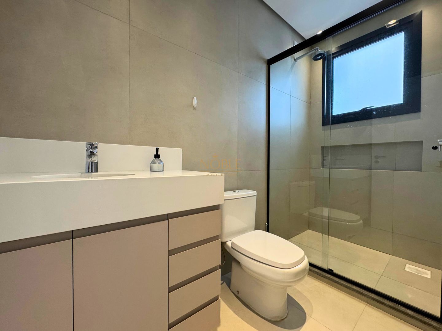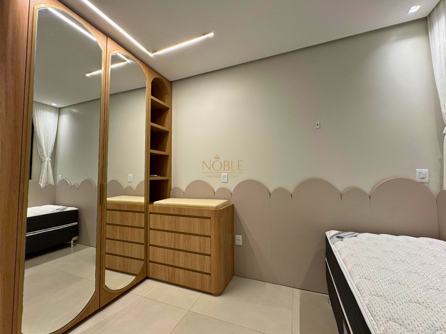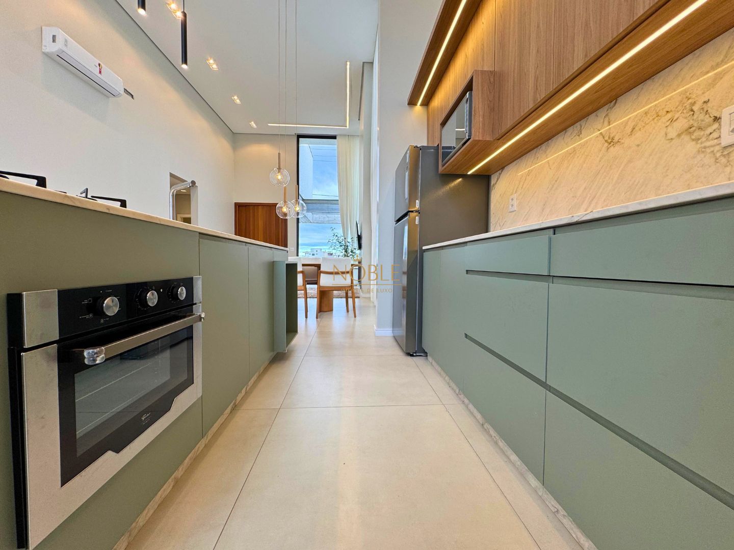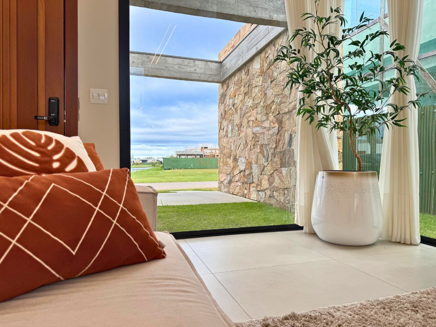 A casa conta com 201m² de área útil, 03 suítes, sala de estar, jantar e cozinha, lavabo, lareira, churrasqueira, espaço coberto para três automóveis,