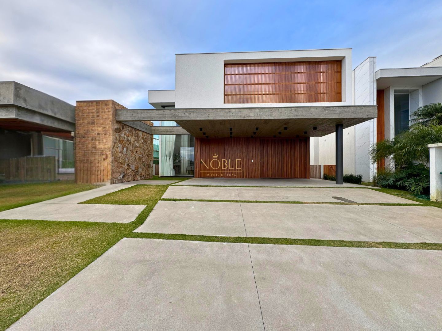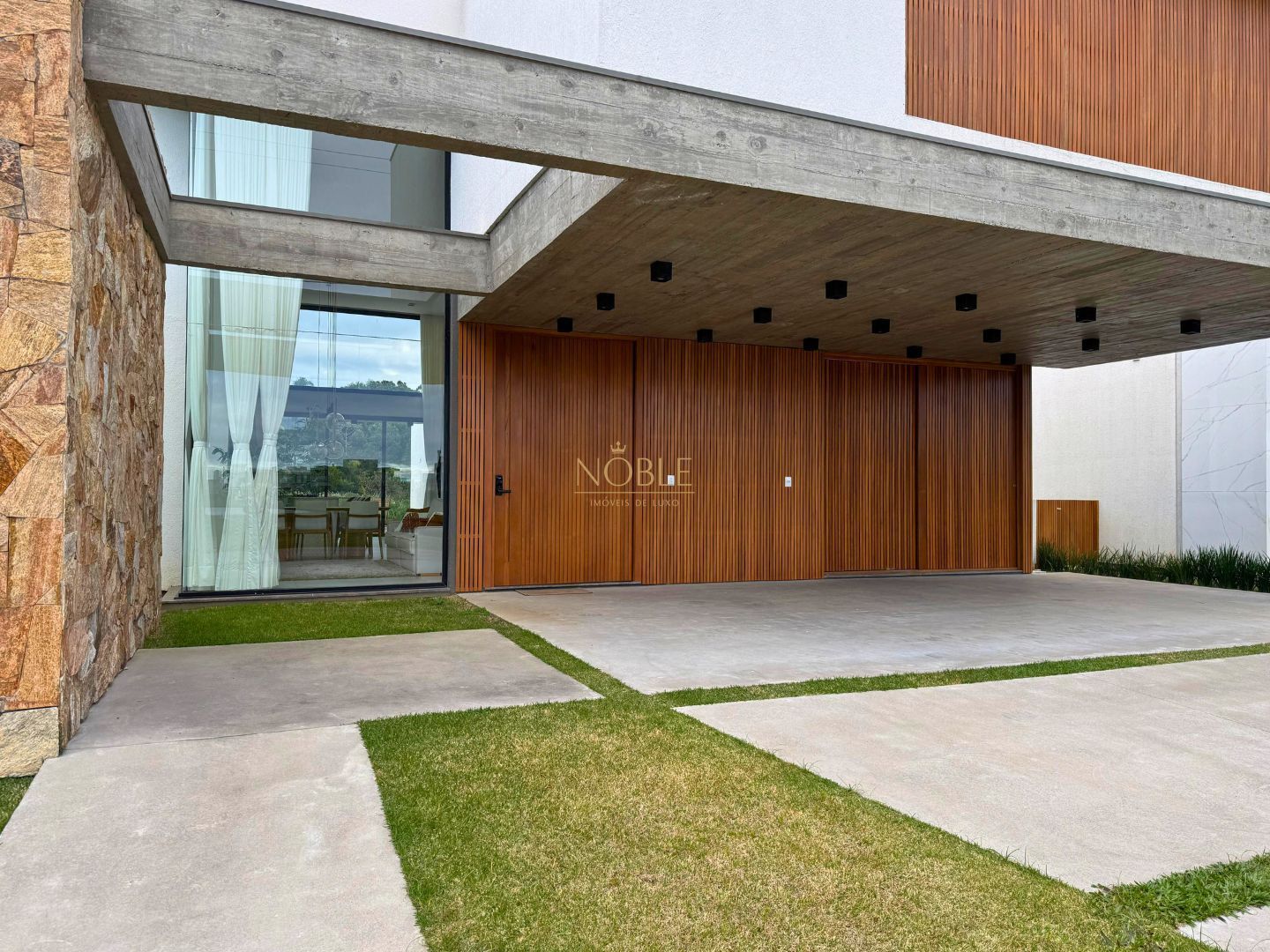 Linda casa térrea com fachada imponente e detalhes em concreto aparente, brises de madeira e pedras naturais.