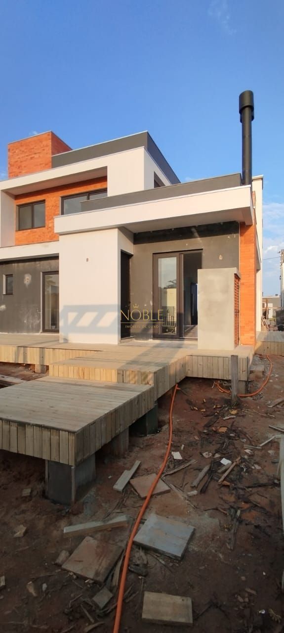A casa também conta com lareira e churrasqueira, ideais para desfrutar de momentos aconchegantes. O paisagismo na área externa complementa a beleza do ambiente.