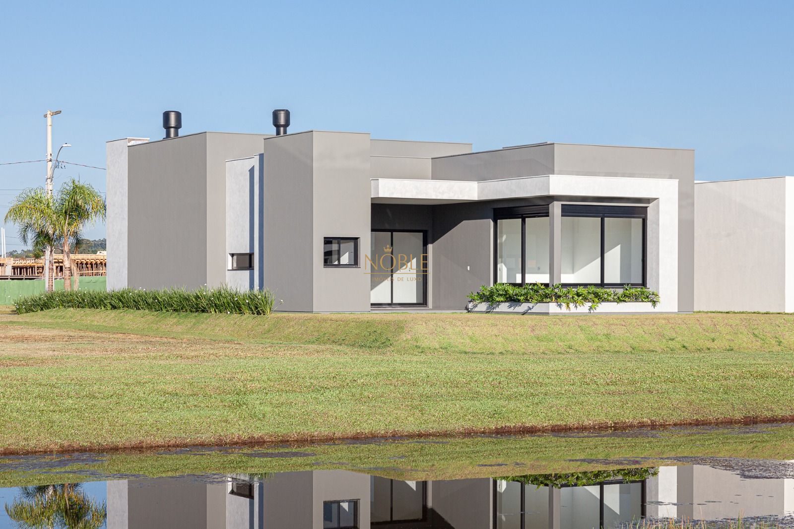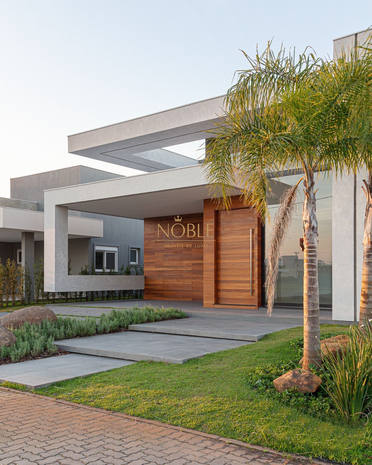 A casa possui uma fachada imponente com detalhes em madeira, pé direito elevado, amplas esquadrias e paisagismo.