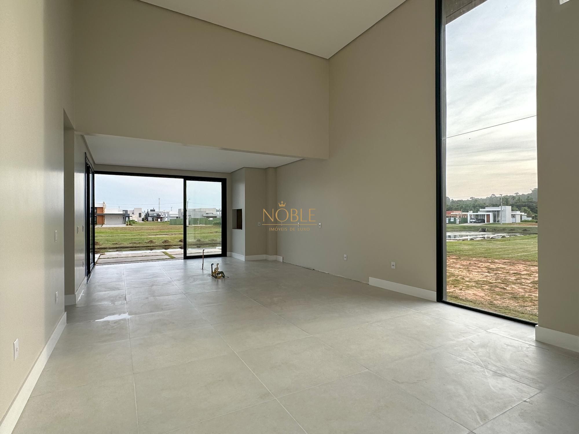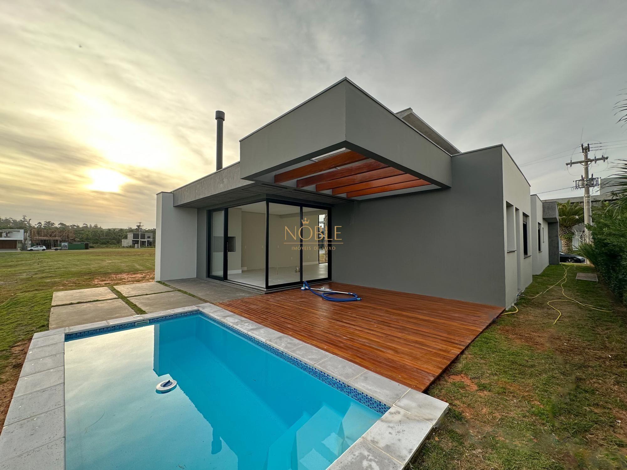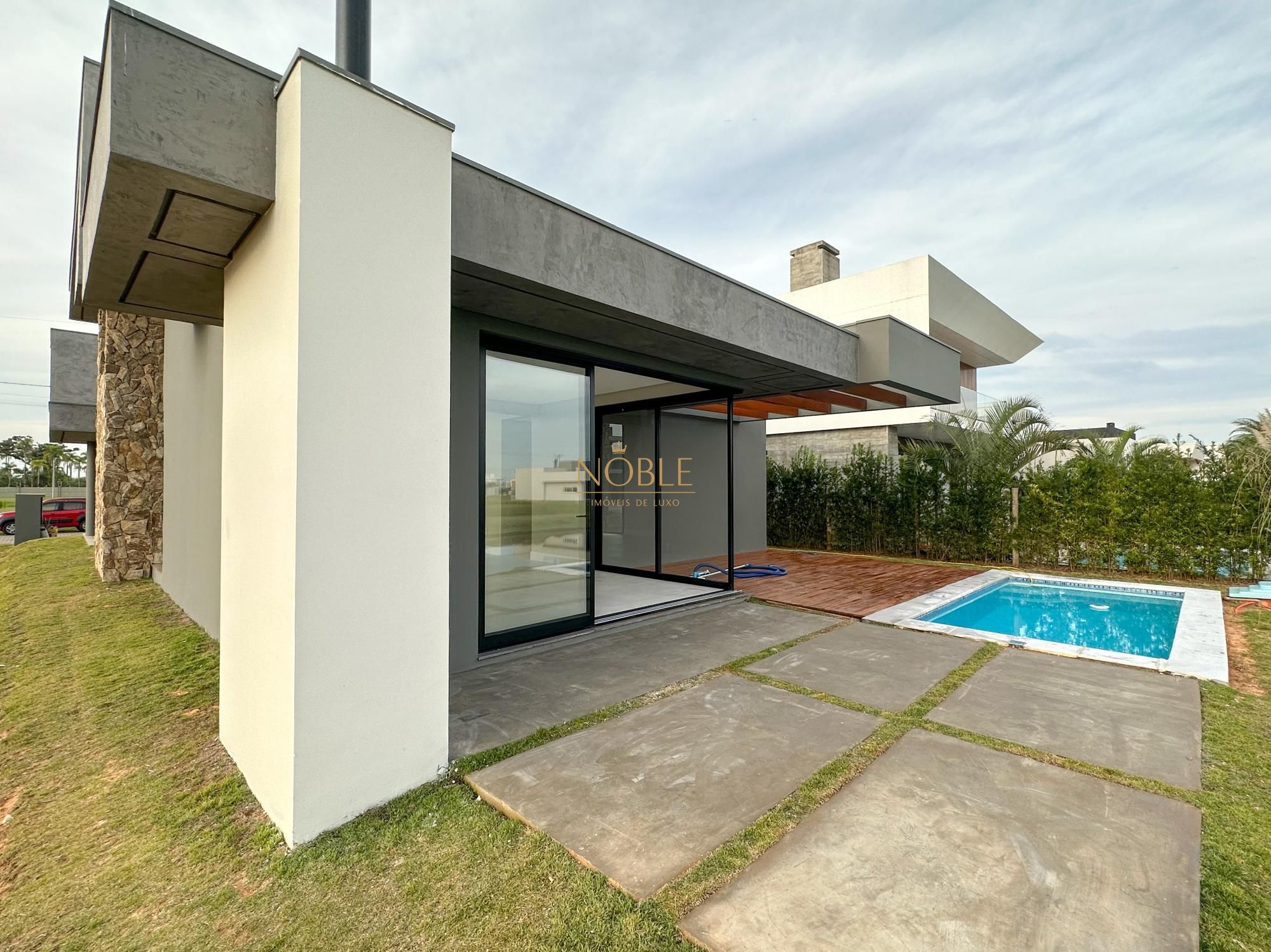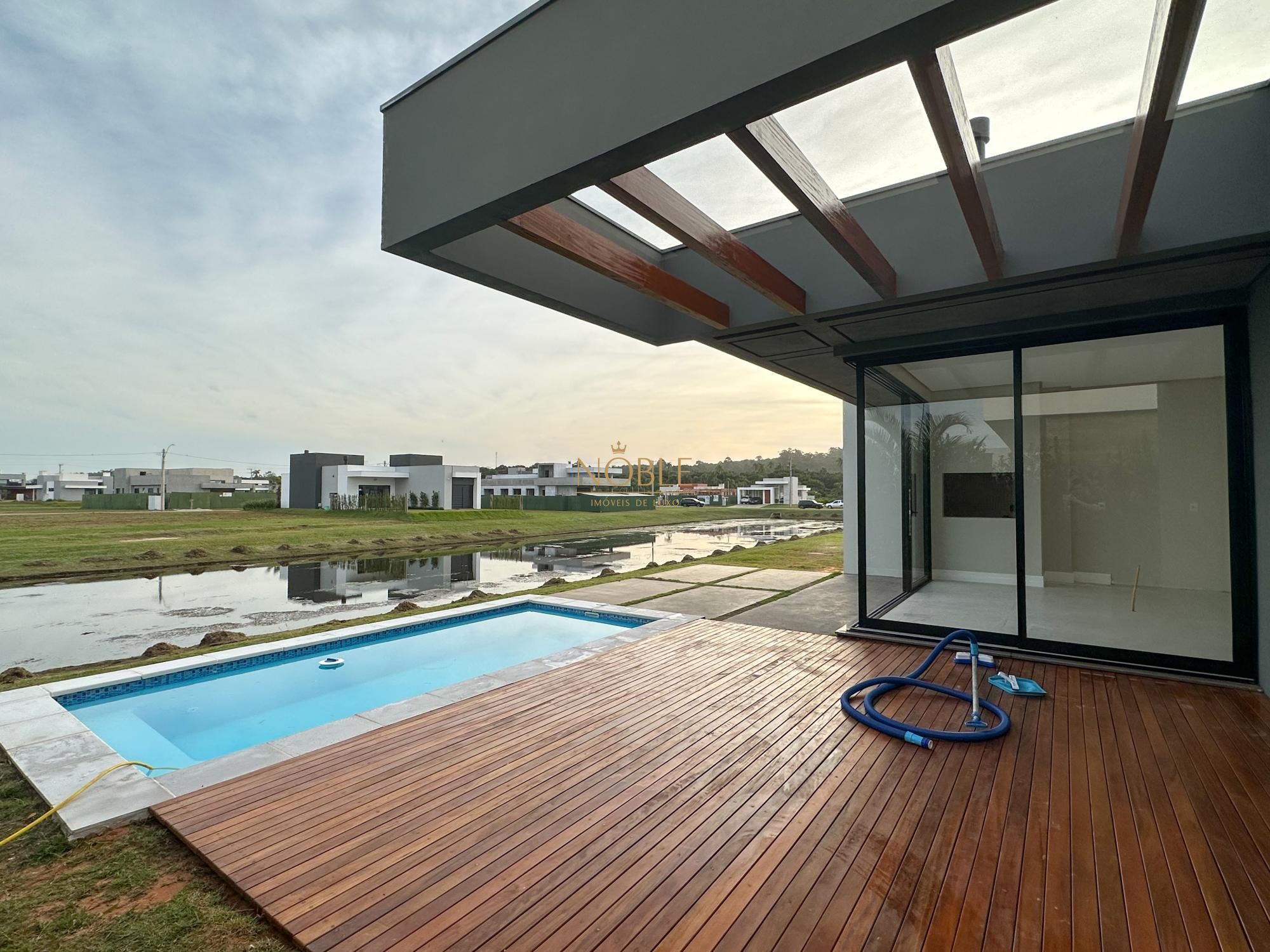 Casa nova com 3 suites, em processo de instalação de mobiliada, pé direito duplo no living, lareira, churrasqueira, deck com piscina, banheiro social, sala de estar e jantar e vaga de garagem coberta para 2 carros.
