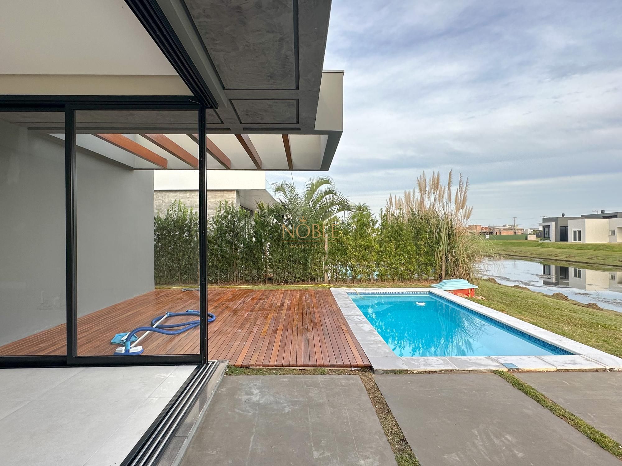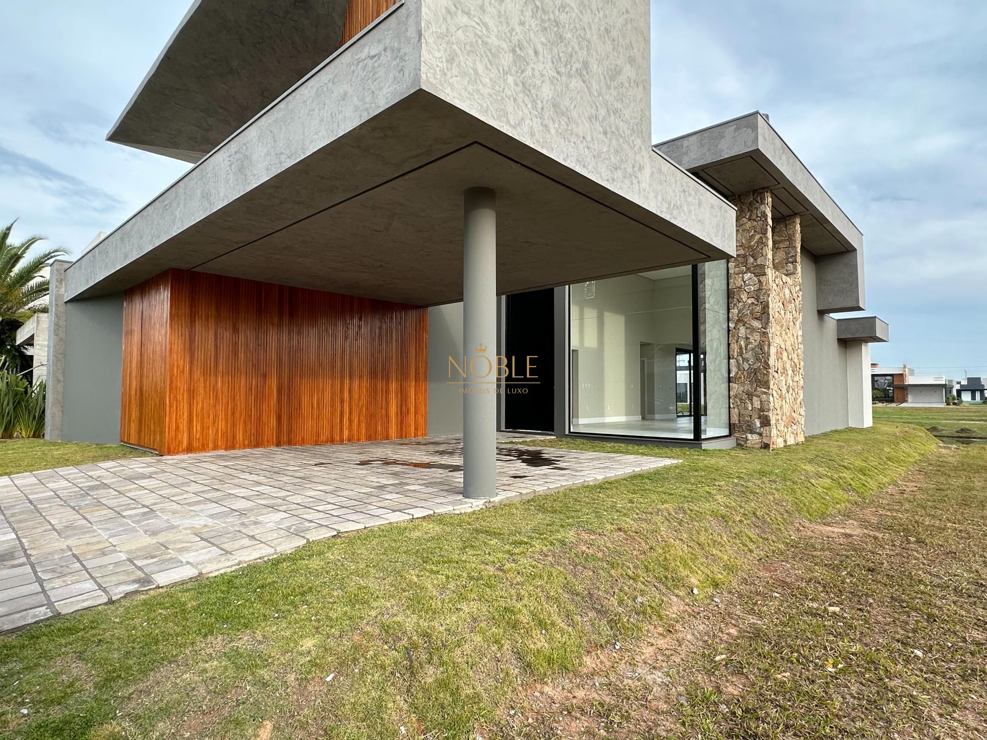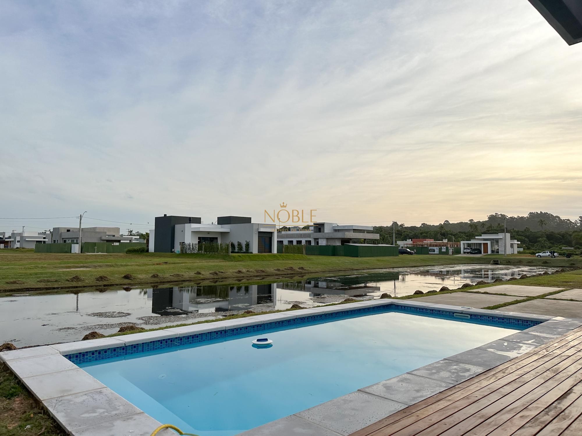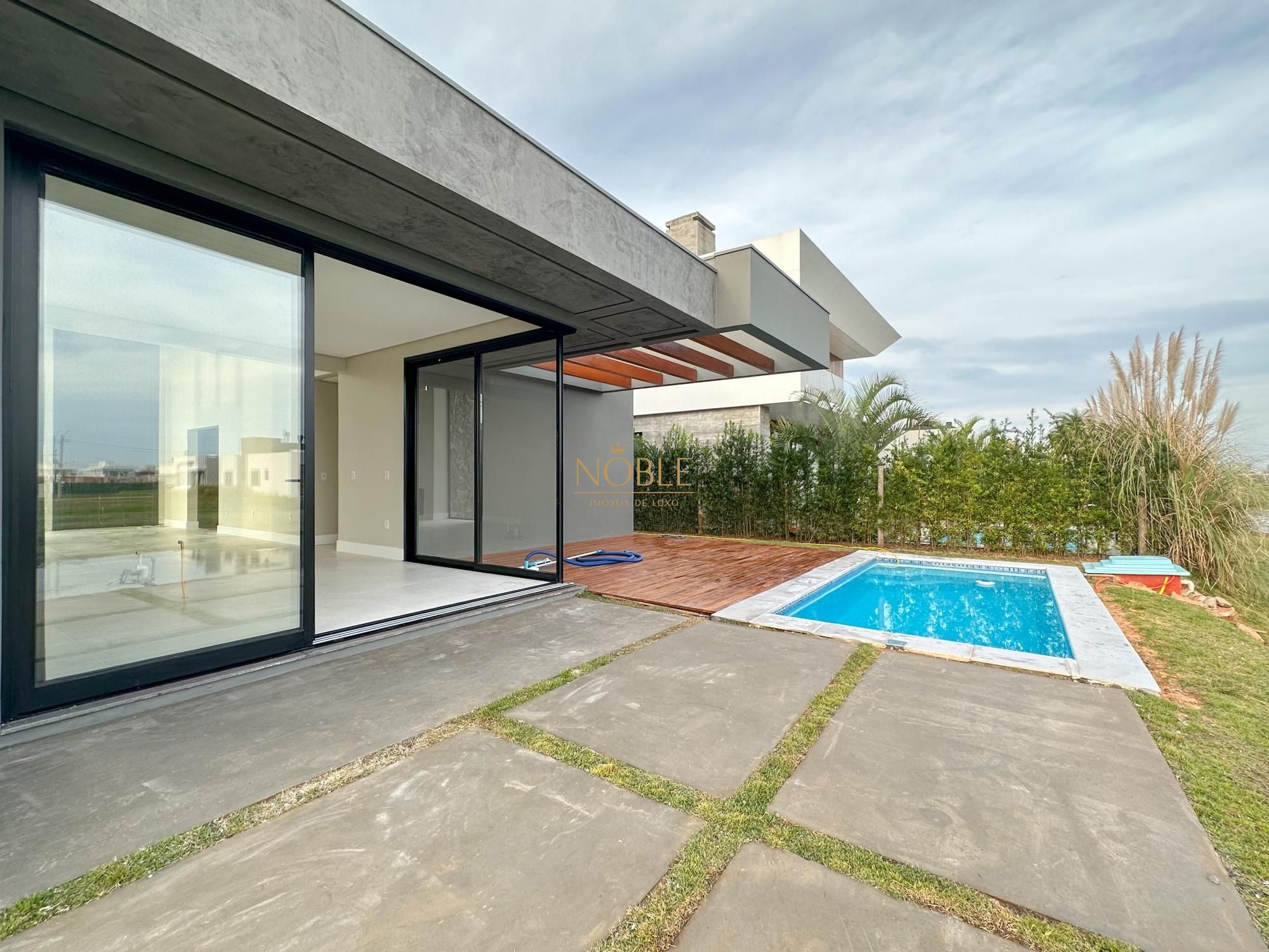 Casa nova com 3 suites, em processo de instalação de mobiliada, pé direito duplo no living, lareira, churrasqueira, deck com piscina, banheiro social, sala de estar e jantar e vaga de garagem coberta para 2 carros.